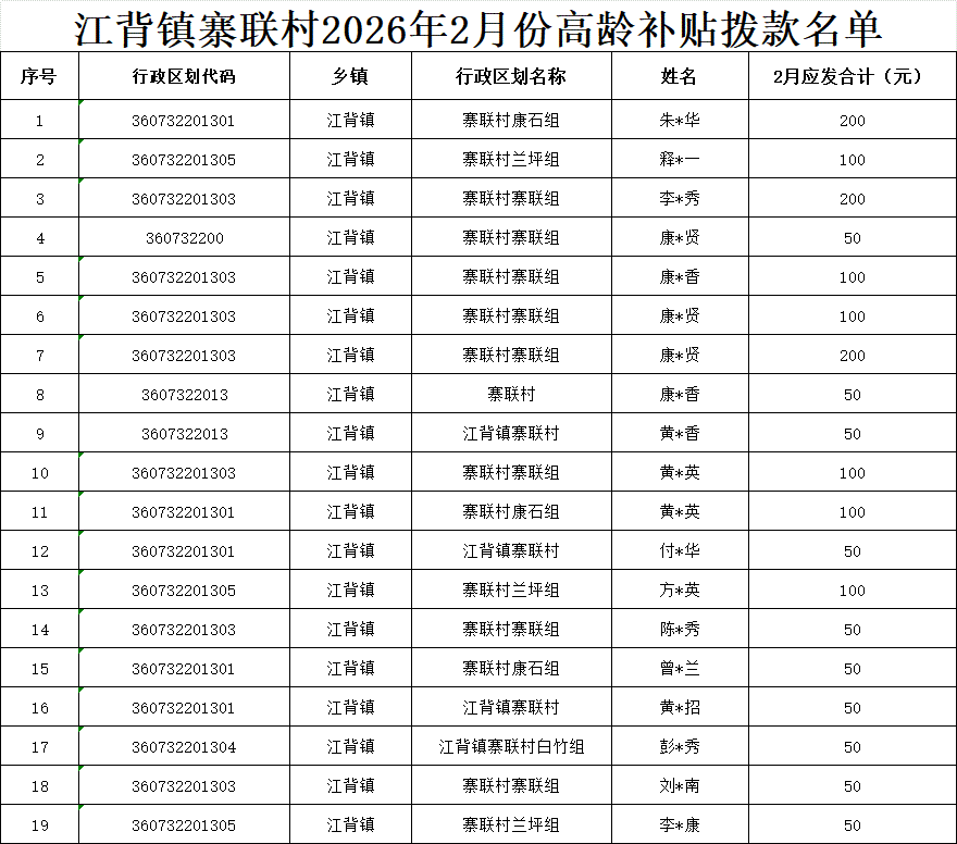 【養老服務】江背鎮寨聯村2026年2月份高齡補貼撥款名單