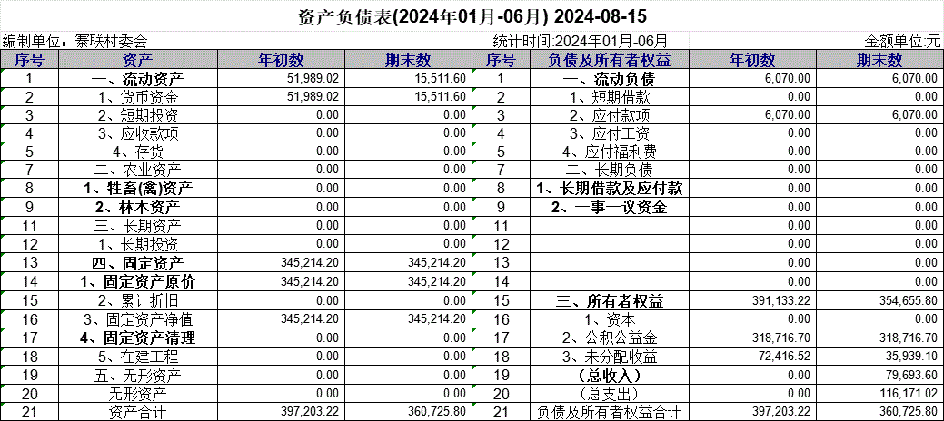 【財務收支】寨聯村2024年第二季度資產負債表公示