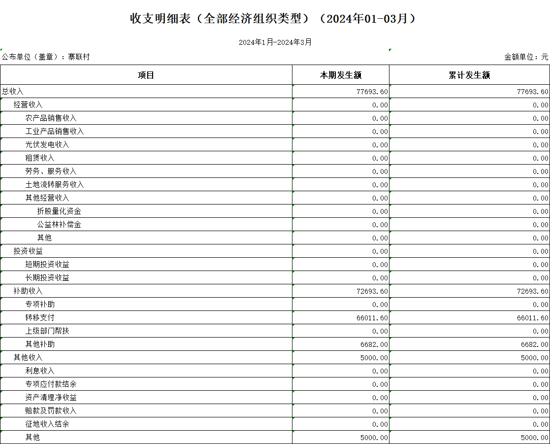 【財務收支】寨聯村2024年第一季度收支明細表公示