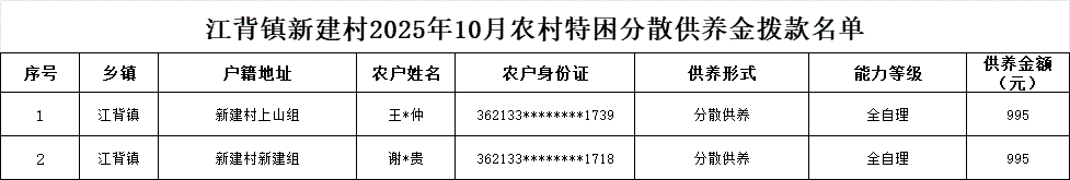 【社會救助】江背鎮新建村2025年10月農村特困分散供養金撥款名單