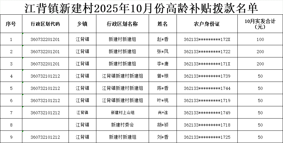 【養老服務】江背鎮新建村2025年10月份高齡補貼撥款名單