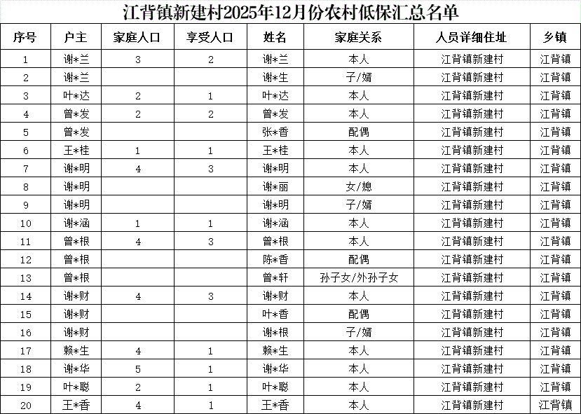 【社會救助】江背鎮新建村2025年12月份農村低保匯總名單