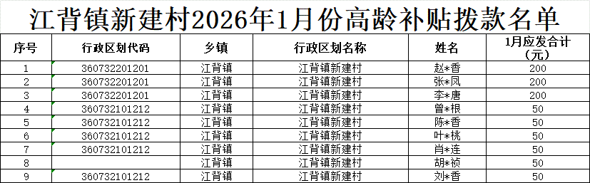 【養(yǎng)老服務(wù)】江背鎮(zhèn)新建村2026年1月份高齡補(bǔ)貼撥款名單