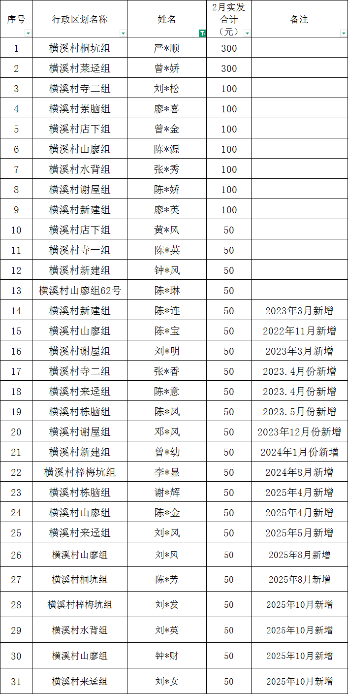 社富鄉橫溪村2026年2月份高齡補貼撥款名單