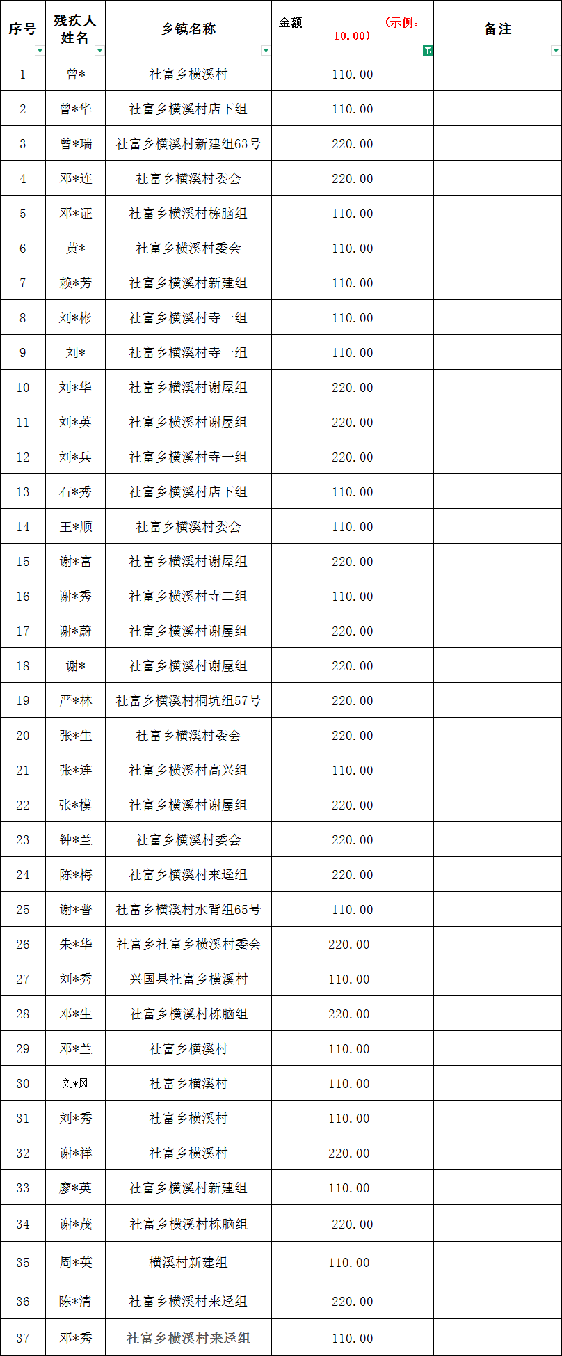 社富鄉橫溪村2026年2月份殘疾人兩項補貼撥款名單