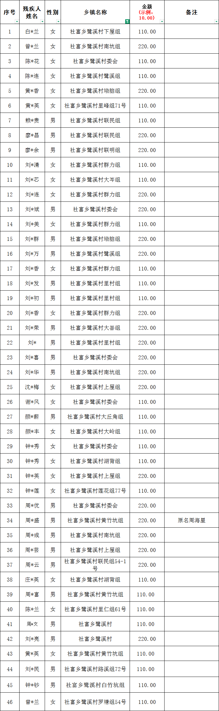 社富鄉鷺溪村2026年1月份殘疾人兩項補貼撥款名單