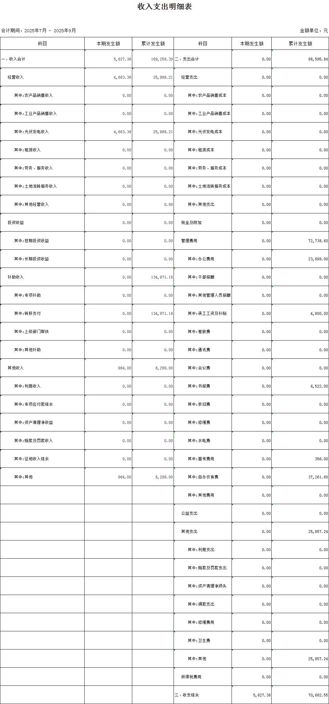 鷺溪村2025年第三季度村級(jí)收入支出明細(xì)表