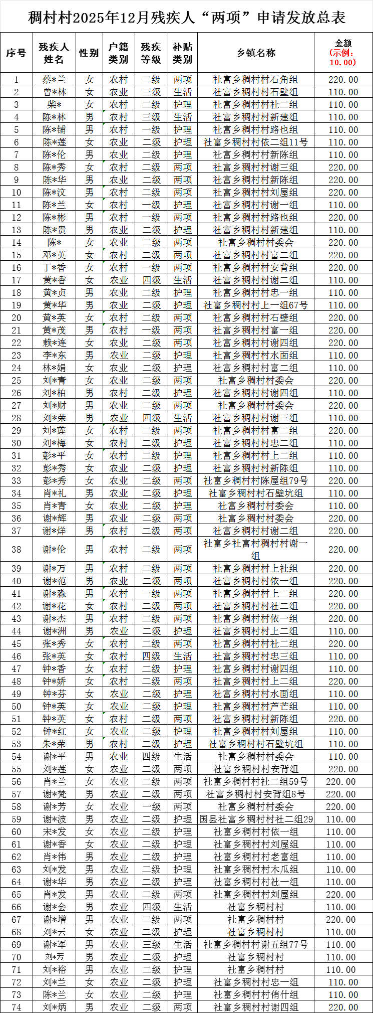 稠村村2025年12月殘疾人“兩項(xiàng)”申請(qǐng)發(fā)放總表