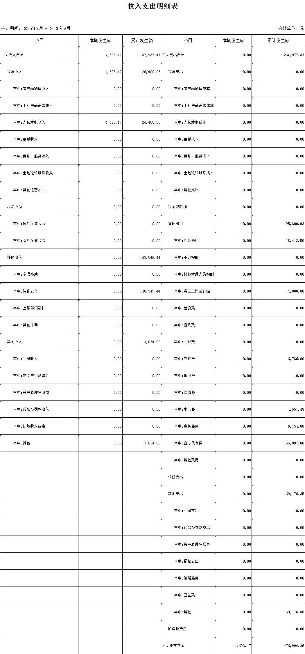 稠村村2025年第三季度村級收入支出明細表
