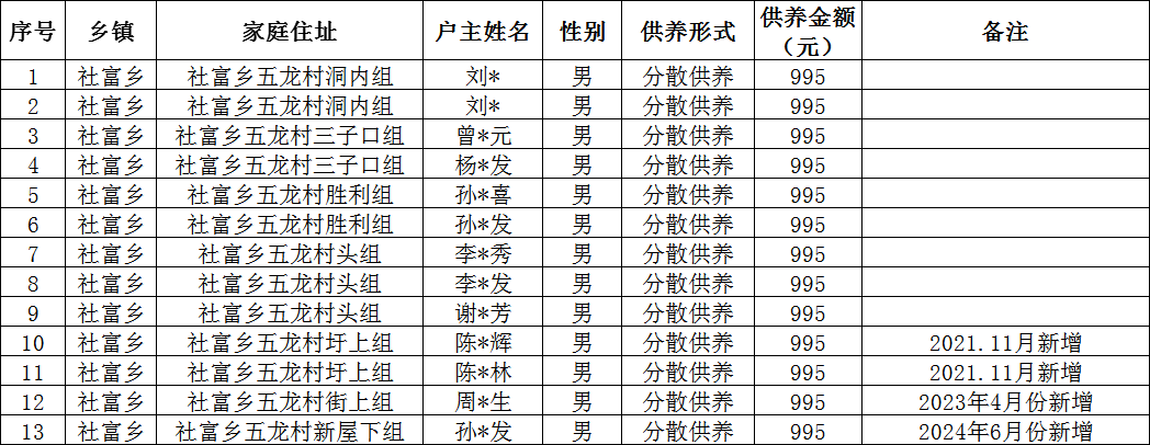 社富鄉五龍村2025年12月農村特困分散供養金撥款名單