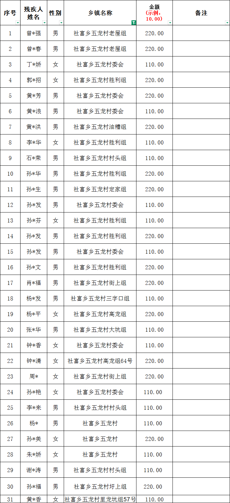 社富鄉(xiāng)五龍村2026年2月份殘疾人兩項(xiàng)補(bǔ)貼撥款名單