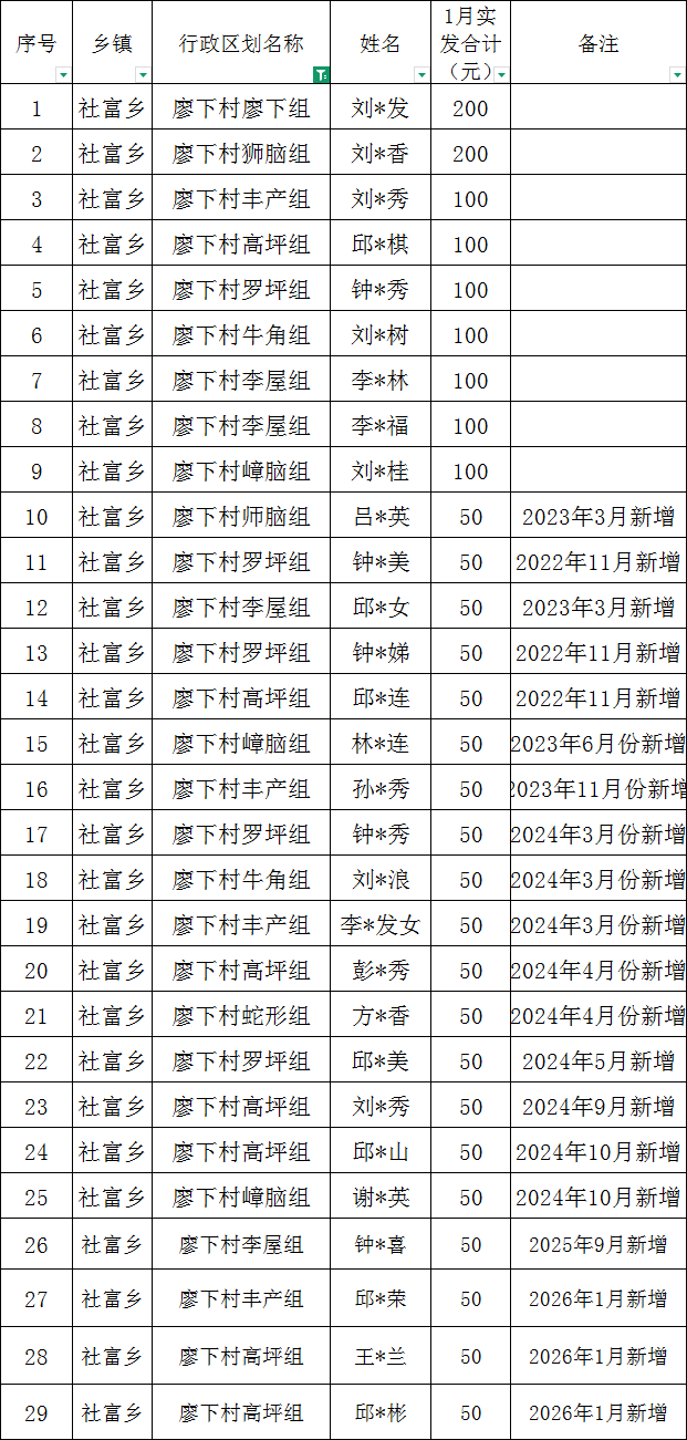 社富鄉(xiāng)廖下村2026年1月份高齡補(bǔ)貼撥款名單