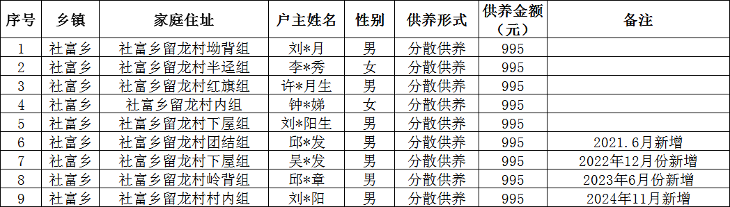 社富鄉(xiāng)留龍村2025年12月農(nóng)村特困分散供養(yǎng)金撥款名單