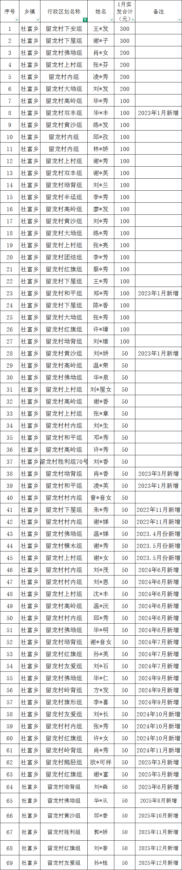 社富鄉(xiāng)留龍村2026年1月份高齡補貼撥款名單