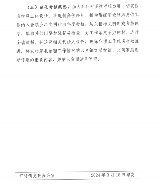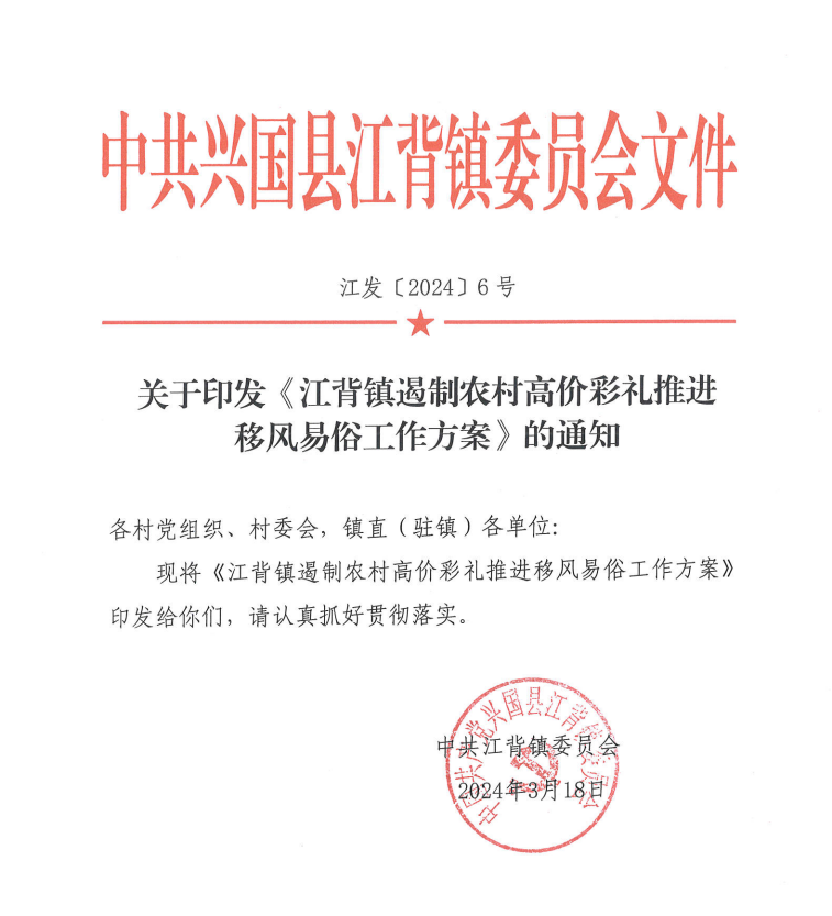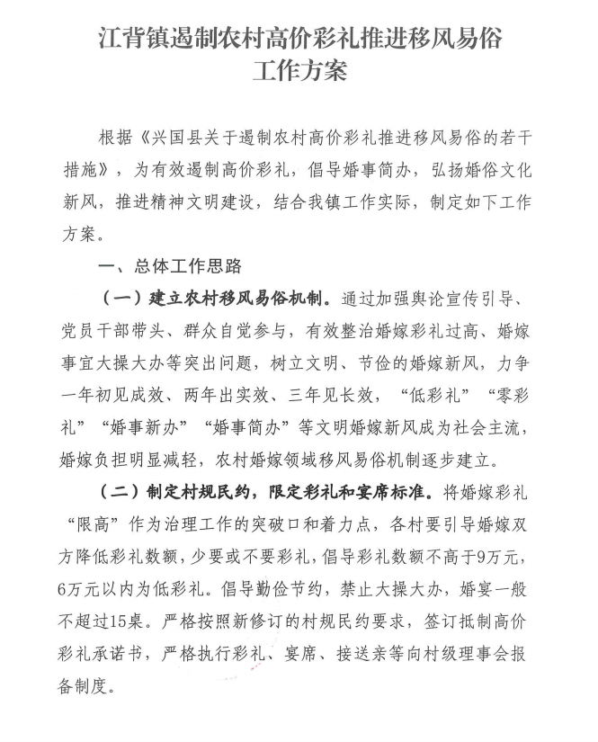 興國縣江背鎮人民政府關于印發《江背鎮遏制農村高價彩禮推進移風易俗工作方案》的通知