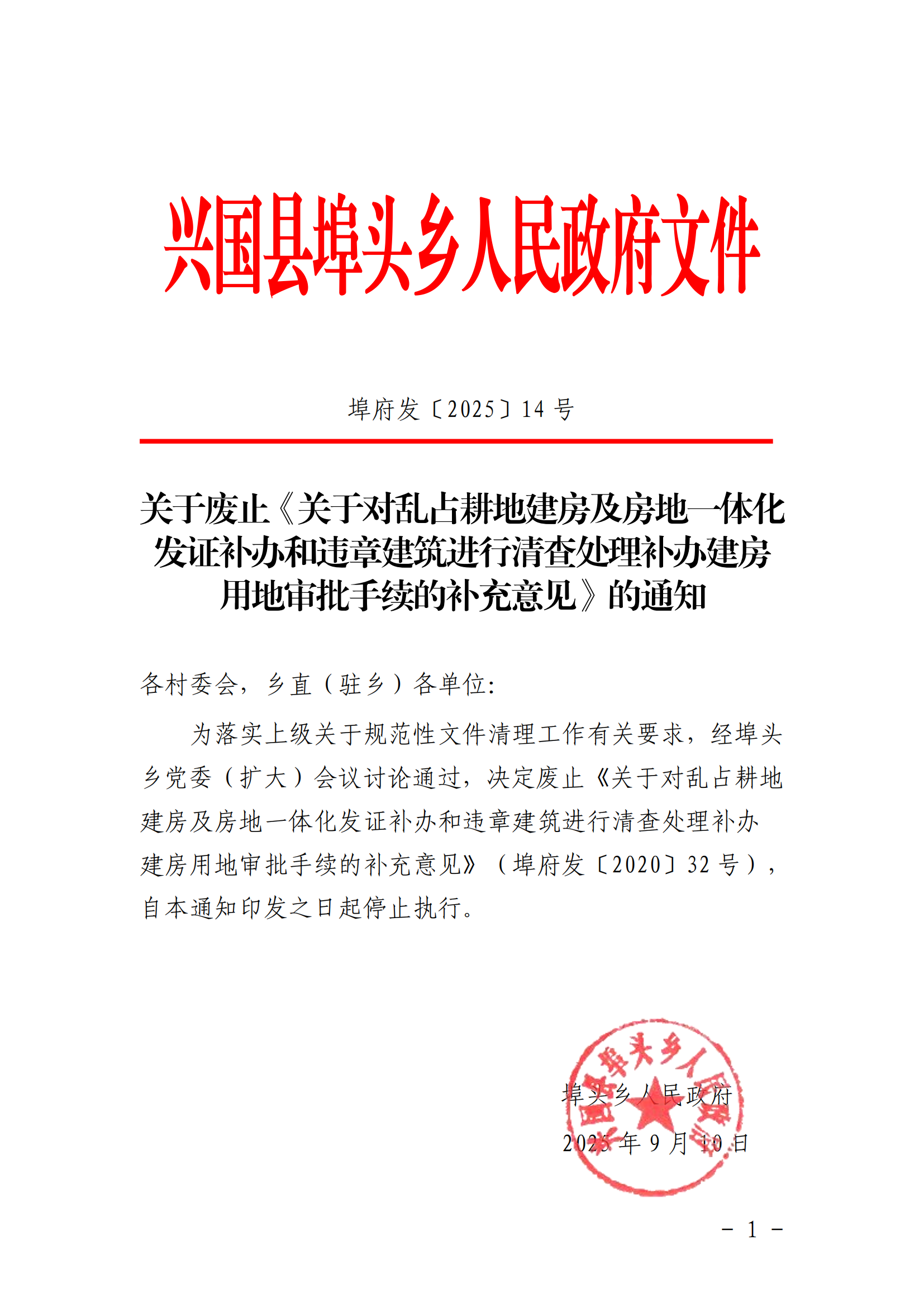 關于廢止《關于對亂占耕地建房及房地一體化發證補辦和違章建筑進行清查處理補辦建房用地審批手續的補充意見》的通知