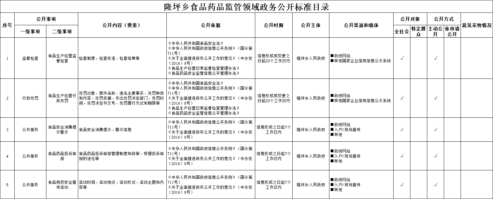 隆坪鄉食品藥品監管領域政務公開標準目錄