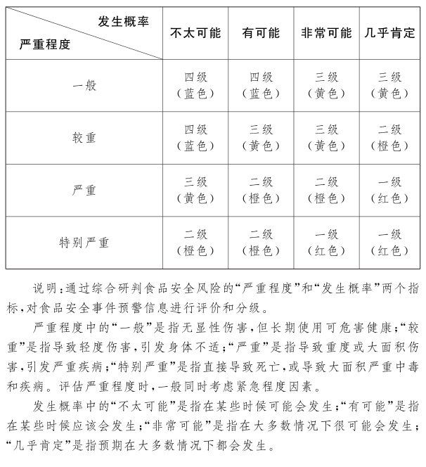 按照性質、可能造成的損失或危害程度、可控性、影響范圍等因素,遵從國家食品安全專項應急預案的規(guī)定,本省食品安全事件分為四個級別,即一般食品安全事件、較大食品安全事件、重大食品安全事件和特別重大食品安全事件(分級標準見附件1)。國家食品安全專項應急預案分級標準修訂時從其新標準。