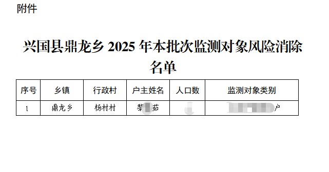 興國縣鼎龍鄉2025年本批次監測對象風險消除名單