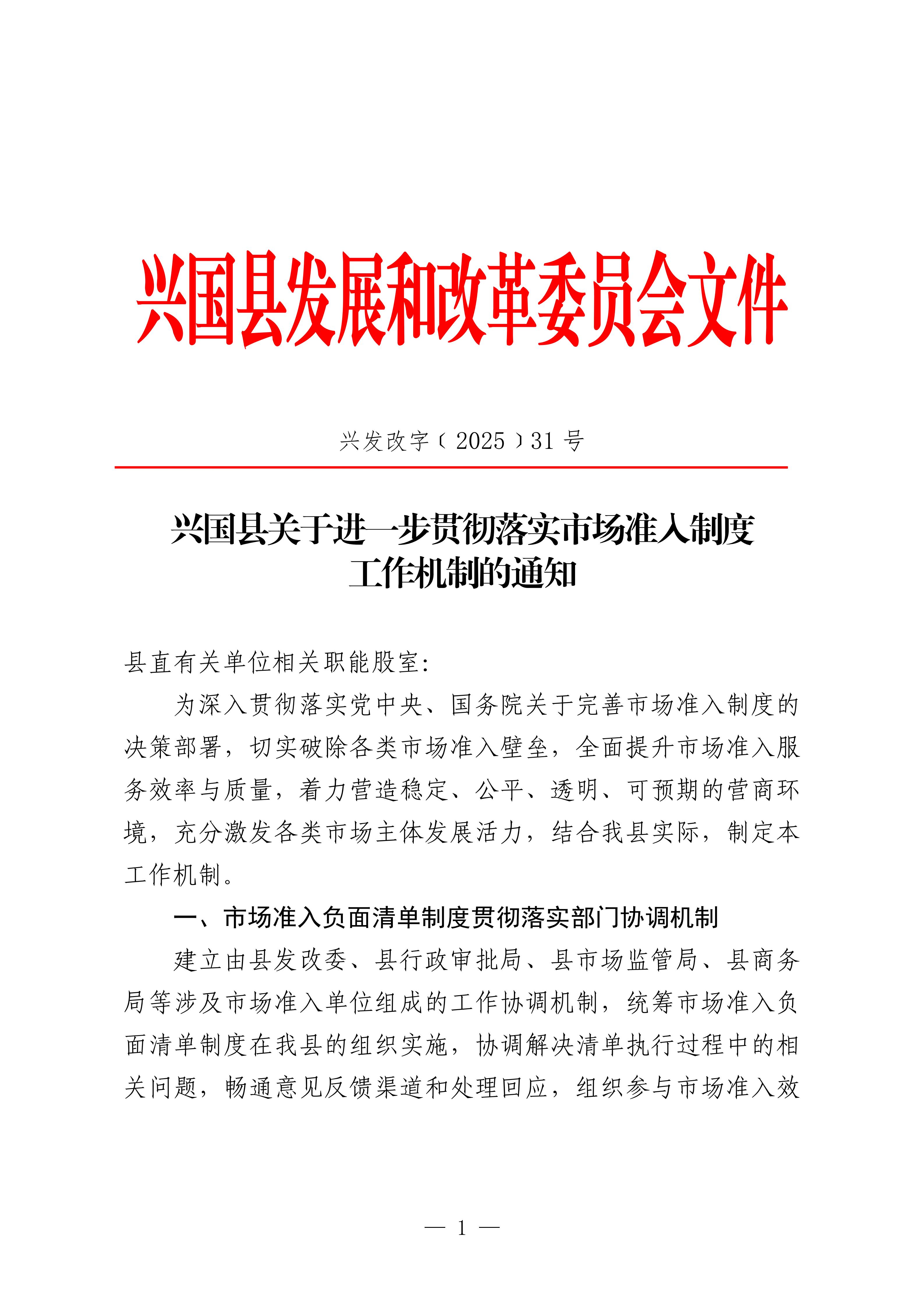 興國縣關于進一步貫徹落實市場準入制度工作機制的通知