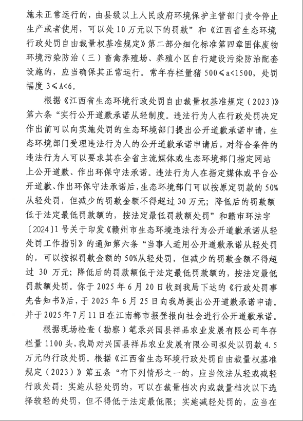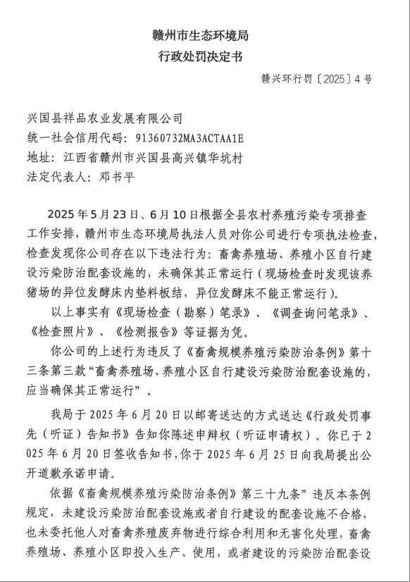 興國(guó)縣祥品農(nóng)業(yè)發(fā)展有限公司行政處罰決定書(shū)公示(贛興環(huán)行罰〔2025〕4號(hào))