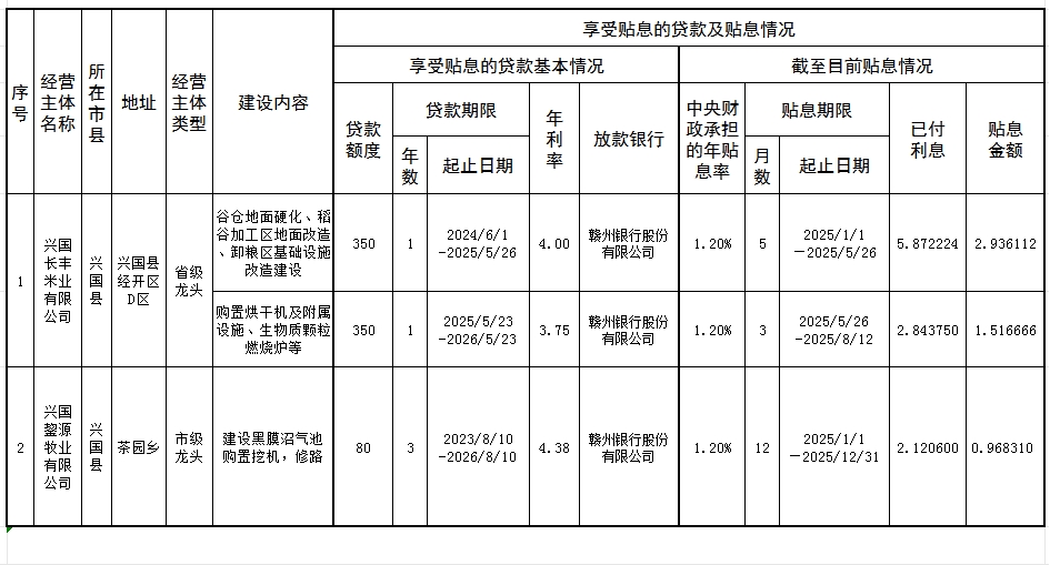 按照農業農村部辦公廳、財政部辦公廳《關于支持糧油等重要農產品產能提升有關政策實施工作通知》(農辦計財〔2023〕20號)和省農業農村廳、省財政廳《關于印發江西省現代設施農業建設貸款貼息試點方案的通知》(贛農字〔2024〕19號)、《關于加強現代設施農業建設貸款貼息試點工作的通知(贛農字(2025]35號)及市農業農村局、市財政局《關于印發贛州市現代設施農業建設貸款貼息試點方案的通知》(贛市農字〔2024〕57號)要求,我局認真組織了公開申報工作,經主體申請、鄉鎮推薦、農業農村部門審核,現將符合申報本項政策的經營主體申報貼息情況公示如下,如有異議請在公示期內實名反饋至縣農業農村局(未實名反饋的不予回應)。