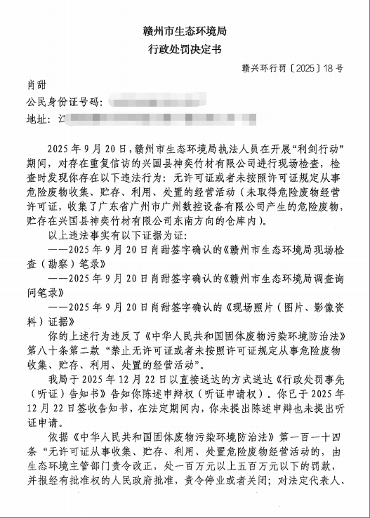 肖甜行政處罰決定書公示(贛興環行罰〔2025〕18號)