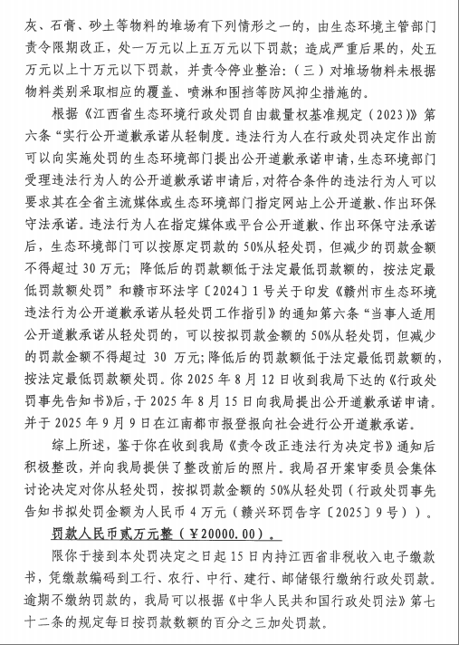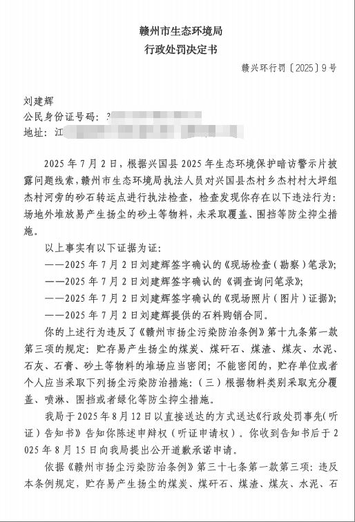 劉建輝行政處罰決定書公示(贛興環行罰【2025】9號)