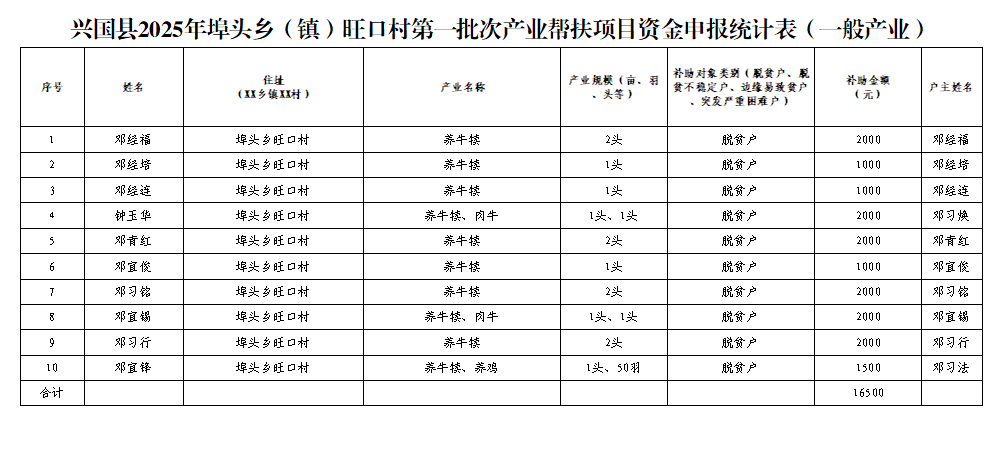 【鄉村振興】旺口村第一批次產業幫扶項目資金申報統計表(一般產業)