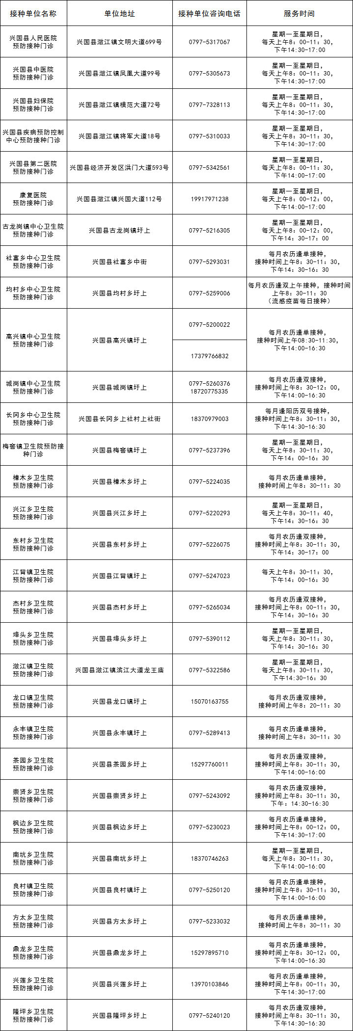 興國(guó)縣流感疫苗預(yù)防接種單位信息一覽表