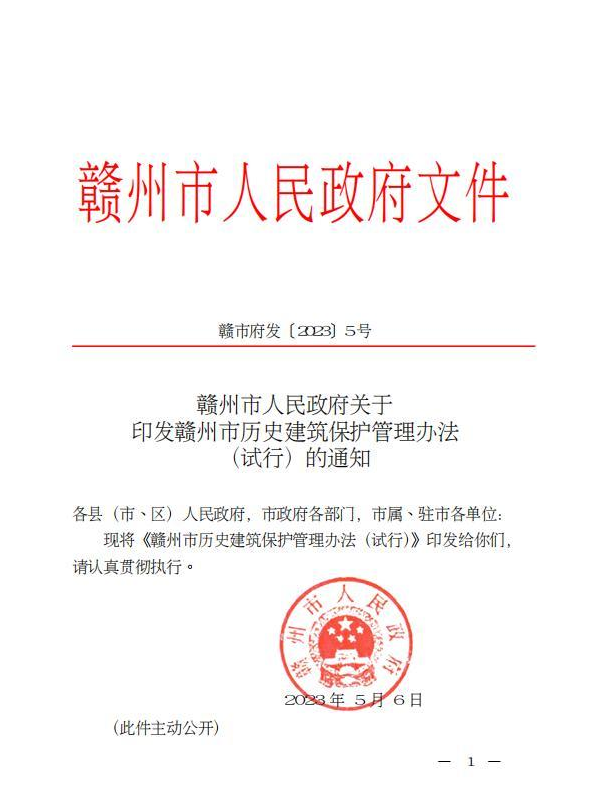 贛州市人民政府《關于印發贛州市歷史建筑保護管理辦法(試行)的通知》