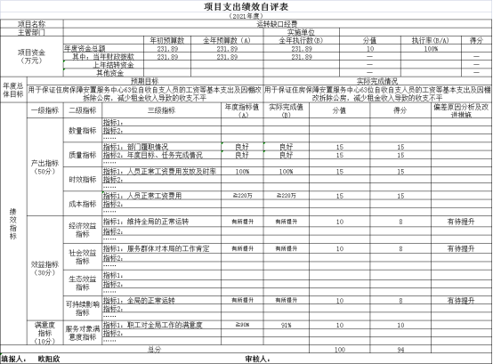 我局本著實事求是的原則,按照既定的評價指標和評價方法,從決策、過程、產出、效益四方面對2021年度運轉缺口經費項目進行績效評價,最終確定績效評價評價得分94分,等級為“優秀”(評價說明:得分≥90分為優秀;80≤得分<90為良好;60≤得分<80為中等;得分<60為差),具體如下(詳見附表):