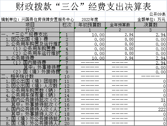 (十六)“三公”經費支出:指用財政撥款安排的因公出國(境)費、公務用車購置及運行維護費和公務接待費。其中,因公出國(境)費反映單位公務出國(境)的國際旅費、國外城市間交通費、住宿費、伙食費、培訓費、公雜費等支出;公務用車購置及運行維護費反映單位公務用車車輛購置支出(含車輛購置稅、牌照費),按規定保留的公務用車燃料費、維修費、過橋過路費、保險費、安全獎勵費用等支出;公務接待費反映單位按規定開支的各類公務接待(含外賓接待)支出。