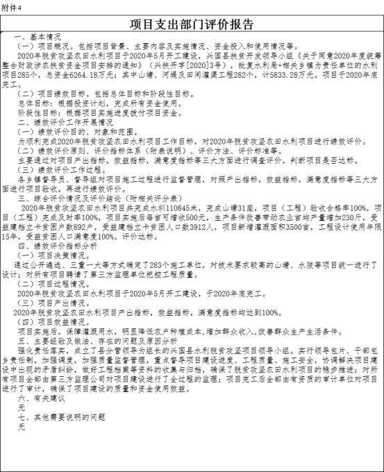 我單位今年在部門決算中反映“2020年脫貧攻堅農田水利項目”、“2020年農村飲水安全鞏固提升項目”項目績效自評結果。