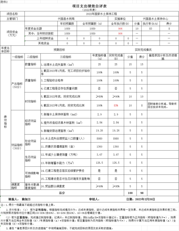 1、評價結果:從整體上看,項目單位按要求完成了2022年國家水土保持重點建設工程項目水土流失治理任務,項目的產出效果及滿意度情況反饋較好,資金使用較完善。經評價組逐一分析評價,最終評分結果為98分,績效評價等級為“優”。