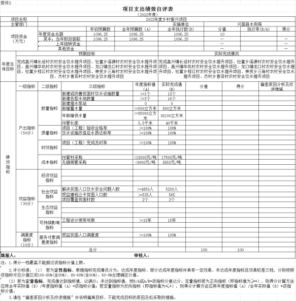 組織開展部門整體支出績效評價,涉及一般公共預算支出11599.12萬元,政府性基金預算支出0萬元。從評價情況來看,2022年完成治理水土流失面積25km2,水土流失治理受益人口數量8980人,改善農田灌溉面積1360畝;五個水庫除險加固項目,收益人口戶數391戶,收益人數1367人,項目受益脫貧戶及監測戶數154戶,項目受益脫貧戶及監測人數270人,收益人數滿意度100%,相關項目評分均已達標;2022年度鄉村振興項目新建或改善貧困村飲水設施數量12個,新建各型水池數量16個,新增蓄水量800立方米,年新增供水量92100立方米,PE管長度40千米,項目驗收合格,解決貧困人口飲水安全問題人數5200人,受益建檔立卡貧困人口數565人,項目覆蓋貧困村個數2個,受益貧困人口滿意度100%,評價達標。