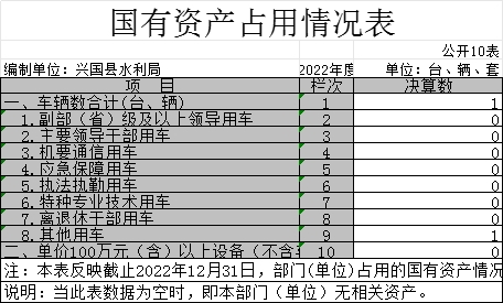 截止2022年12月31日,本部門國有資產占用情況見公開10表《國有資產占用情況表》。其中車輛中的其他用車主要是長岡水庫管理局的新能源車。