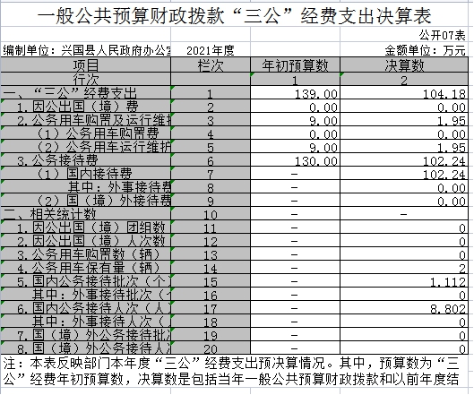 “三公”經費支出:指用一般公共預算財政撥款安排的因公出國(境)費、公務用車購置及運行維護費和公務接待費。其中,因公出國(境)費反映單位公務出國(境)的國際旅費、國外城市間交通費、住宿費、伙食費、培訓費、公雜費等支出;公務用車購置及運行維護費反映單位公務用車車輛購置支出(含車輛購置稅、牌照費),按規定保留的公務用車燃料費、維修費、過橋過路費、保險費、安全獎勵費用等支出;公務接待費反映單位按規定開支的各類公務接待(含外賓接待)支出。