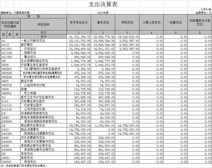 本部門 2018 年度支出總計 4133.12 萬元,其中本年支出合計 4133.12 萬元,較 2017 年增長 59.28%,主要原因是:1、電子商務進農村項目進一步實施; 2、行政機關事業人員工資上調; 3、部分職工崗位晉升;4、招商引資力度加大。年末結轉和結余471.99 萬元,較 2017 年減少 65.85%,主要原因是:兩年以上結轉結余收回財政。