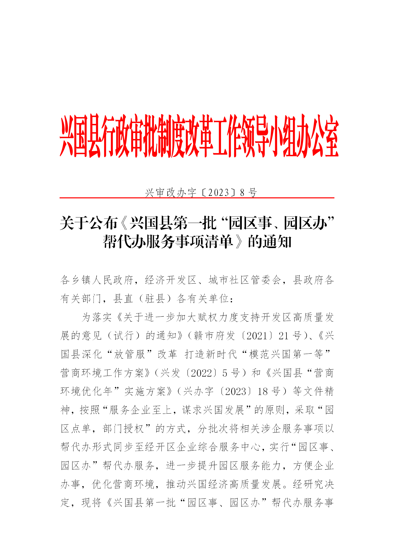 關(guān)于公布《興國(guó)縣第一批“園區(qū)事、園區(qū)辦”幫代辦服務(wù)事項(xiàng)清單》的通知