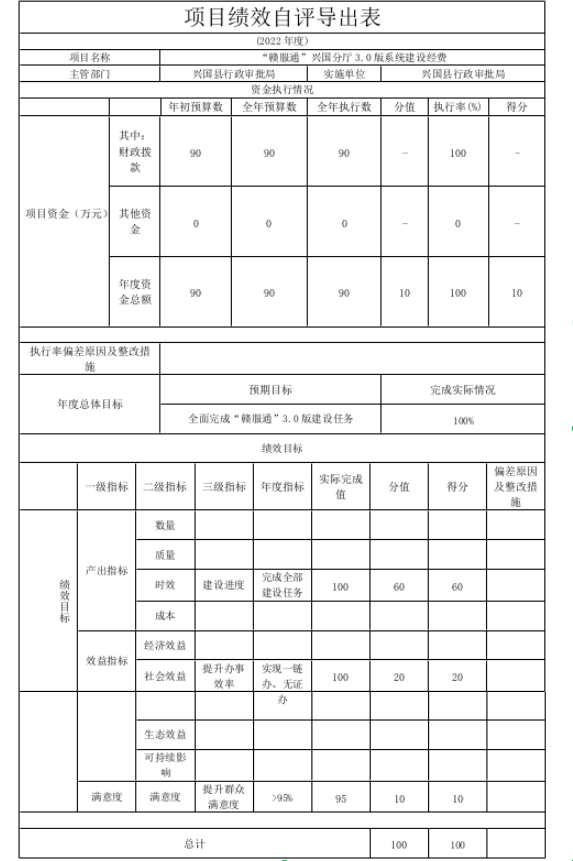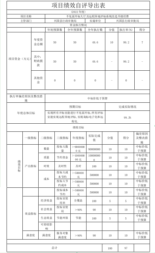 組織對“不見面開標大廳及遠程異地評標系統改造升級經費”、““贛服通”興國分廳3.0版系統建設經費”等2個項目開展了部門評價,涉及一般公共預算支出140萬元,政府性基金預算支出0萬元,國有資本預算支出0萬元。從評價情況來看,符合項目建設預期,有效減少了群眾跑動次數,減少了辦事群眾提交的材料,提升了服務效率。