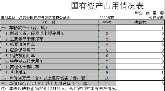截止2020年12月31日,本部門(單位)國有資產占用情況見公開10表《國有資產占用情況表》。其中車輛中的其他用車主要是領導專用轎車,按照規定己上交縣車改辦。