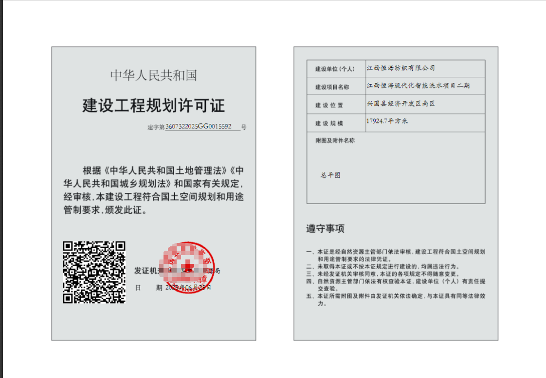 (江西恒?,F(xiàn)代化智能洗水項(xiàng)目(二期))建設(shè)工程規(guī)劃許可批后公布