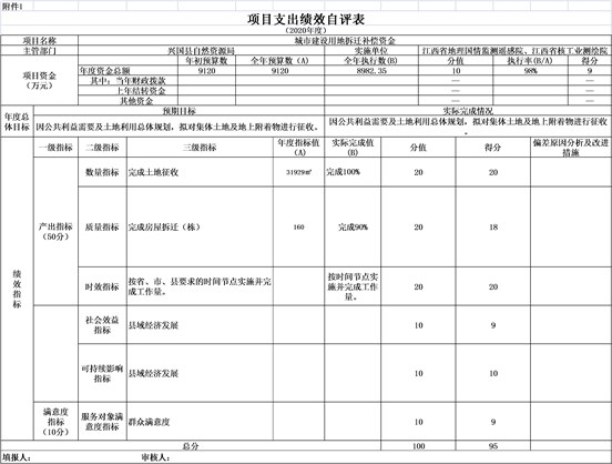 項(xiàng)目績(jī)效自評(píng)總體綜述:根據(jù)年初設(shè)定的績(jī)效目標(biāo),“建設(shè)用地征地拆遷補(bǔ)償”項(xiàng)目績(jī)效自評(píng)得分為95分。項(xiàng)目全年預(yù)算數(shù)為9120萬(wàn)元,執(zhí)行數(shù)為8982.35萬(wàn)元,完成預(yù)算的98%。項(xiàng)目績(jī)效目標(biāo)完成情況:一是完成房屋拆遷90%;二是完成土地征收100%。發(fā)現(xiàn)的問(wèn)題及原因:一是未100%到位,部分房屋因權(quán)屬糾紛無(wú)法實(shí)施。下一步改進(jìn)措施:充分溝通房屋權(quán)利人糾紛事宜,利用多渠道解決。