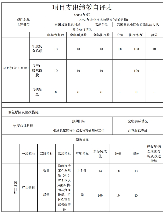 根據預算績效管理要求,我單位組織對納入年度部門預算范圍的二級項目興國縣2022年農業技術與服務專項資金(長江及鄱陽湖重點水域禁捕退捕)1個全面開展績效自評,共涉及資金10萬元,占項目支出總額的30%。