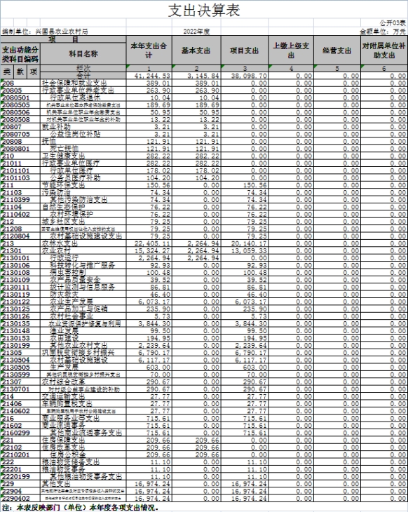 本單位2022年度支出總計41244.53萬元,其中本年支出合計41244.53萬元,較2021年減少14847.12萬元,下降26.5 %,主要原因是:2022年統(tǒng)籌整合銜接鄉(xiāng)村振興項目資金指標調劑到鄉(xiāng)鎮(zhèn)撥付以及減少了蔬菜項目支出;年末結轉和結余 0萬元,較2021年增加(減少)0 萬元,增長(下降)0 %,主要原因是:當年未使用資金財政已收回,年末無結轉結余資金。