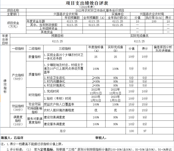 經(jīng)匯總,我縣農村環(huán)衛(wèi)一體化項目自評總得分為97分。
