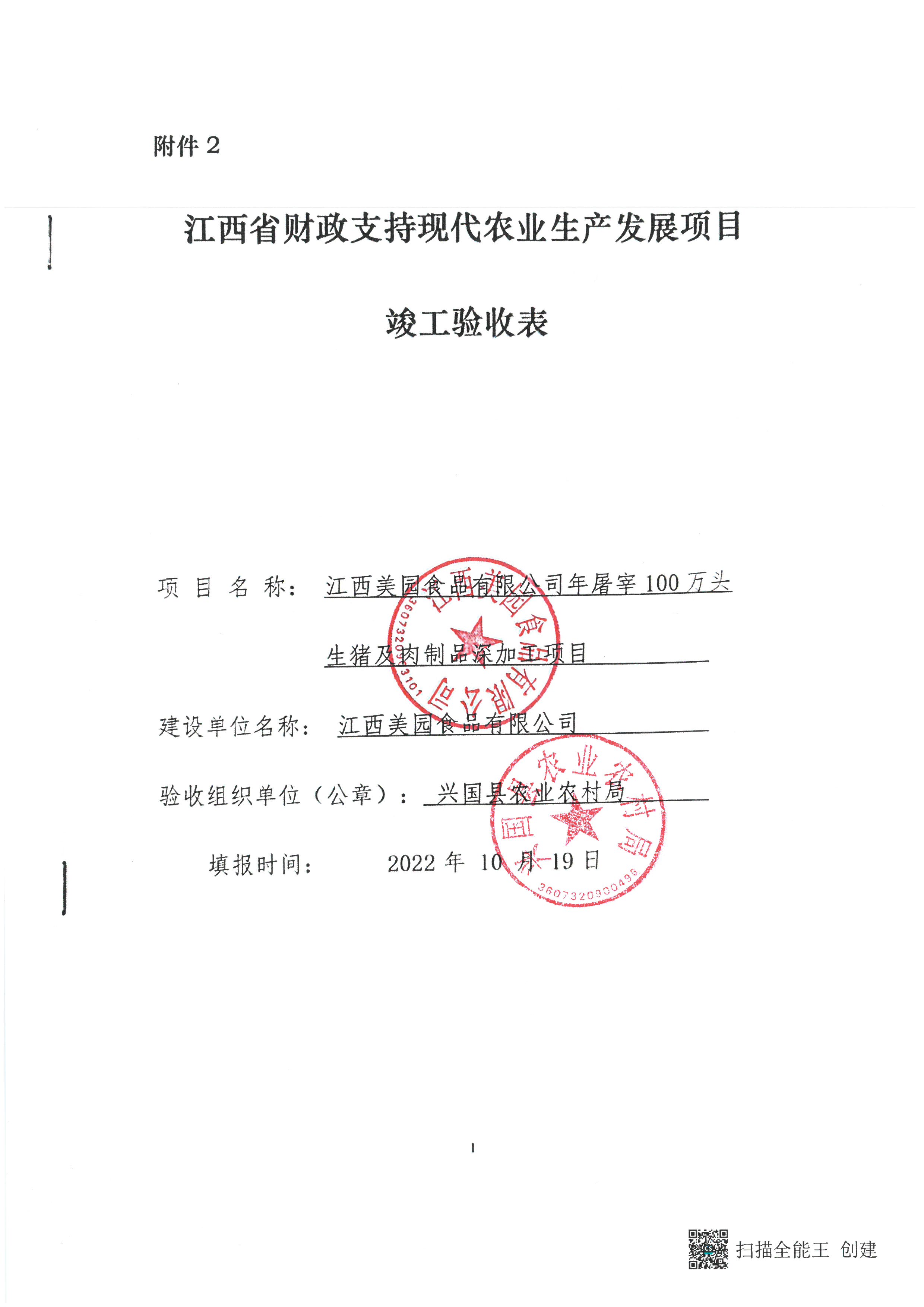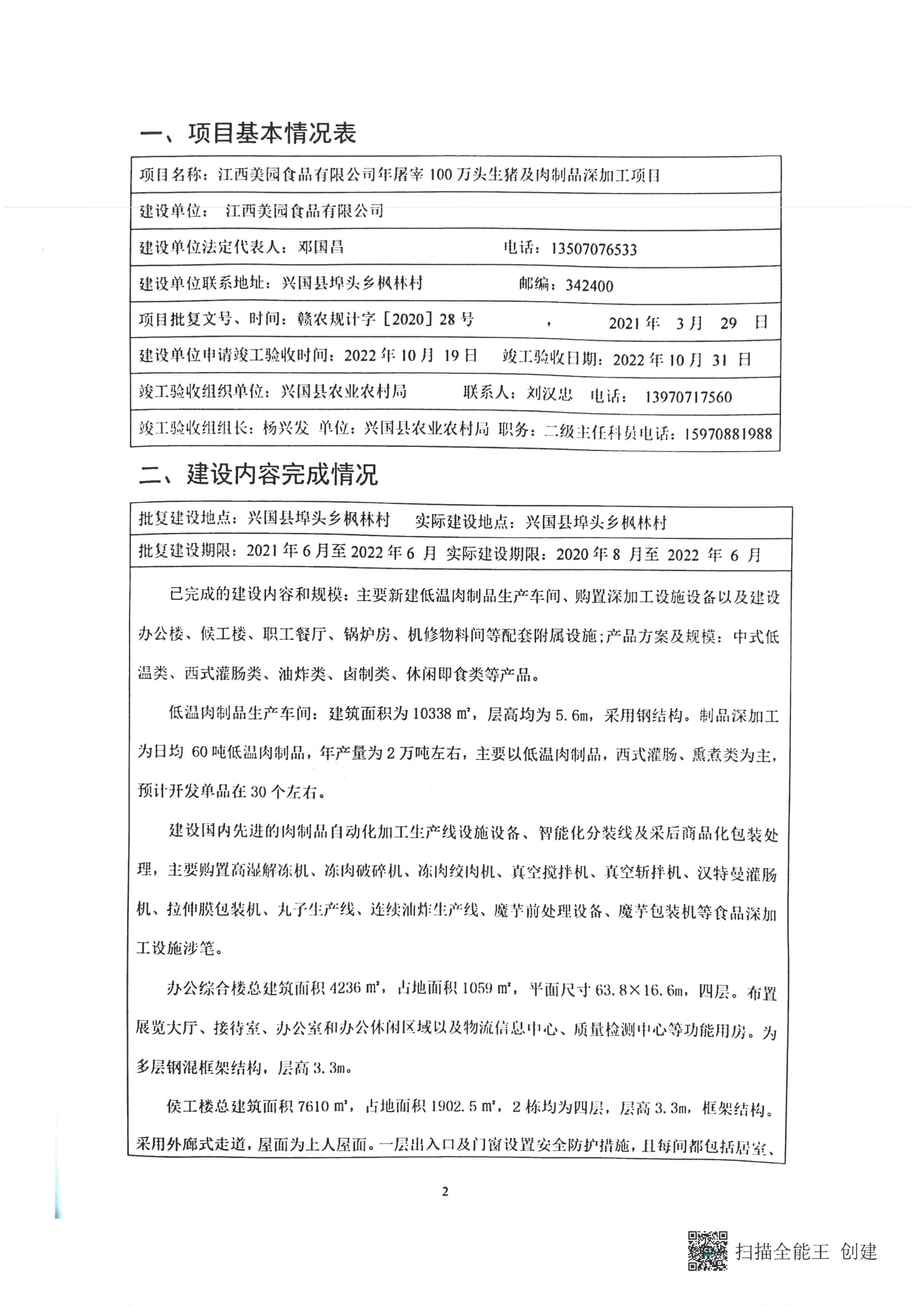 江西美園食品有限公司年屠宰100萬頭生豬及肉制品深加工項目竣工驗收情況