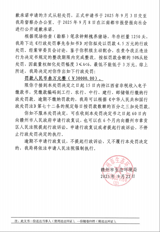 鐘鮮槐行政處罰決定書公示(贛興環行罰【2025】8號)