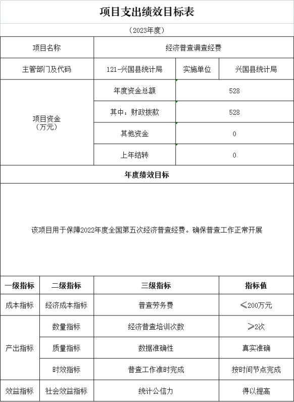 6.年度績效目標:該項目用于保障2022年度全國第五次經濟普查經費。確保普查工作正常開展。